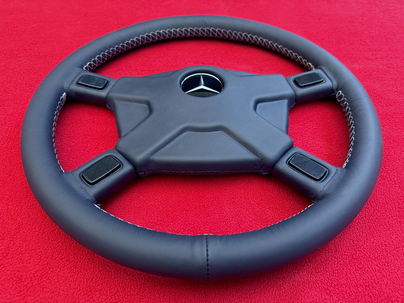 The wheel’s refurbishment ensures that the leather feels soft, clean, and free of cracks or fading. The stitching has been restored to factory-style tightness and alignment, maintaining originality while providing a like-new presentation. The horn pad, featuring the Mercedes-Benz three-pointed star, is removable and allows convenient access to the wheel’s internal structure and wiring configuration.