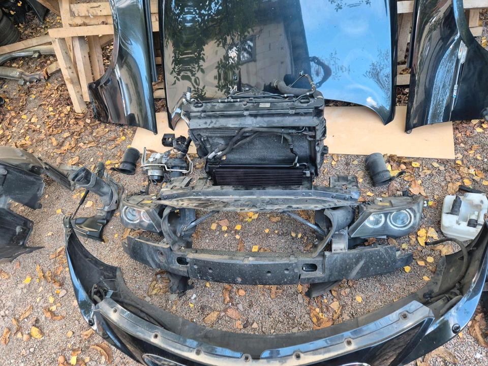 Full original BMW M6 E63 front-end package in 475 Sapphire Black Metallic — complete front bumper assembly, bonnet, headlights (bi-xenon with modules), lock carrier + radiator package, both fenders, wheel-arch panels and all small/trim parts. Sold as a single, ready-to-install unit — no repaint needed.