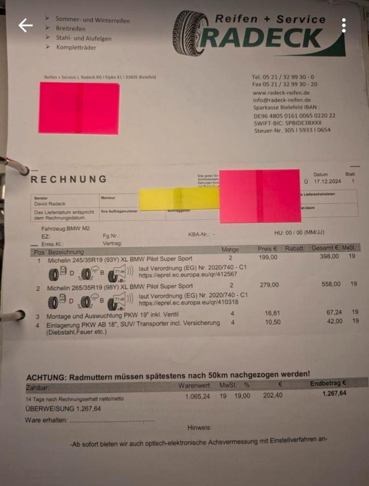 Tires: New Michelin summer tires, purchased 17.12.24, invoice available